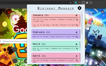 ผู้จัดการวันเกิดเป็นส่วนขยายที่ง่ายและมีประสิทธิภาพที่มีอยู่สำหรับ Chrome มันช่วยให้ผู้ใช้สามารถติดตามวันเกิดที่กำลังจะมาถึงและไม่พลาดวันที่สำคัญเลย